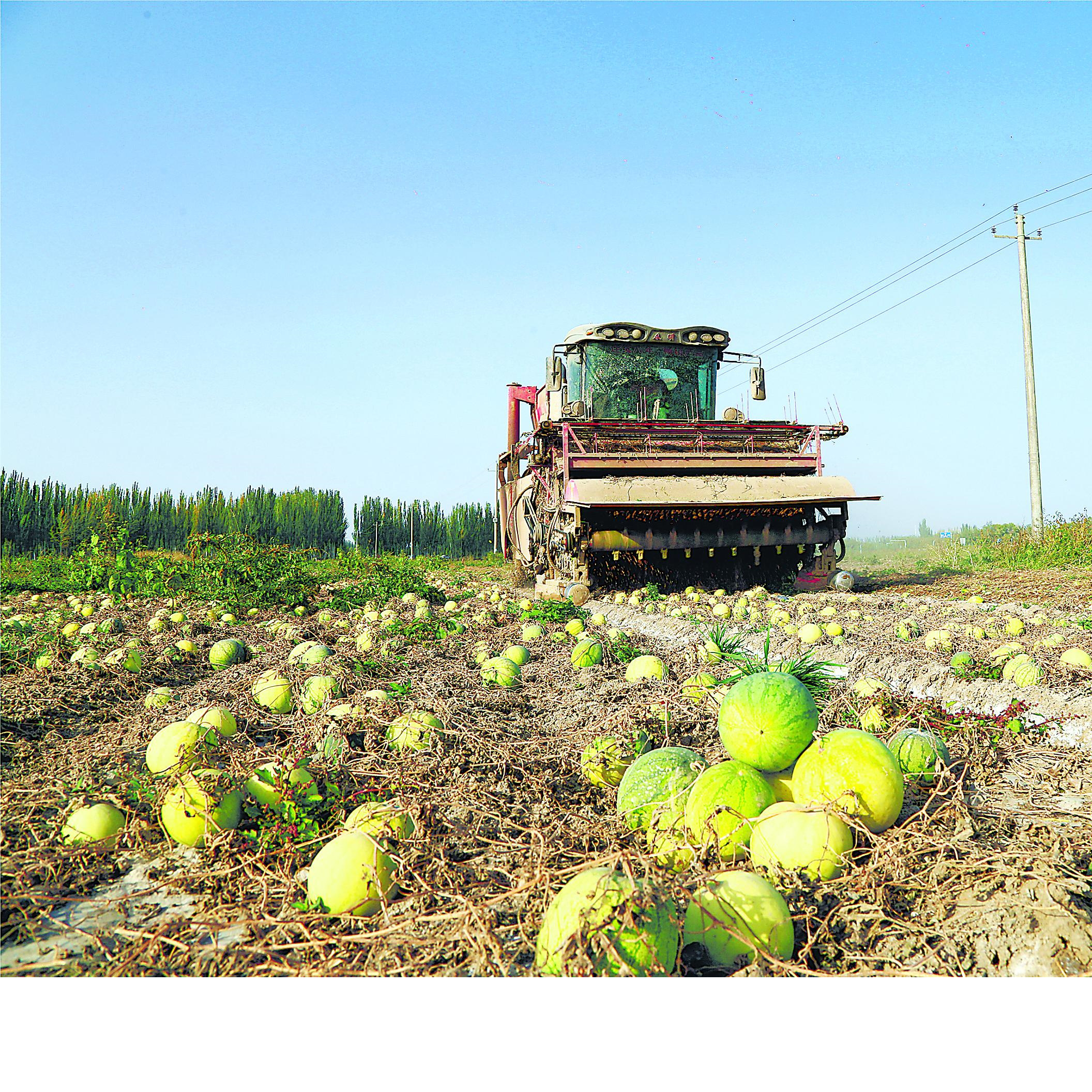 10月9日,种植户驾驶农机在阿瓦提县塔木托格拉克镇塔木托格拉克村采收籽瓜。眼下,阿瓦提县种植的4000亩籽瓜喜获丰收,农民抢抓晴好天气及时采收,田间地头一派忙碌景象。□包良廷摄